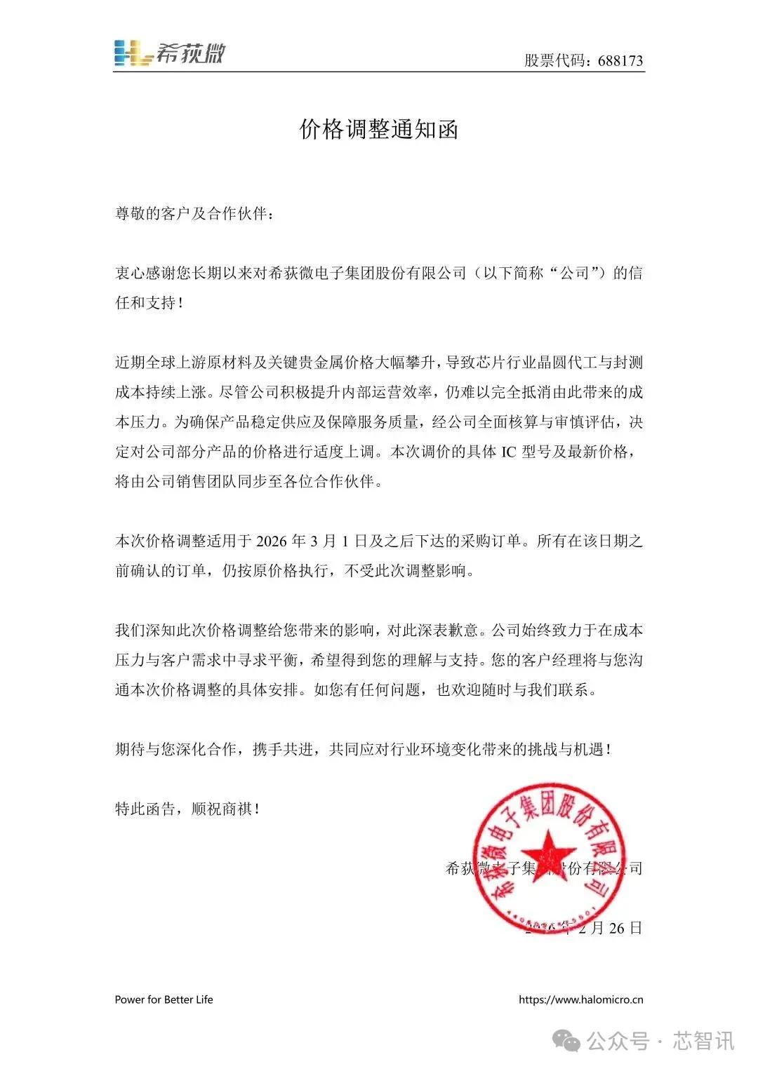 近日,国产模拟芯片厂商希荻微通过官方微信发布涨价函,宣布对部分产品价格进行适度上调。本次价格调整适用于2026年3月1日及之后下达的采购订单。所有在该日期之前确认的订单,仍按原价格执行,不受此次调整影响。